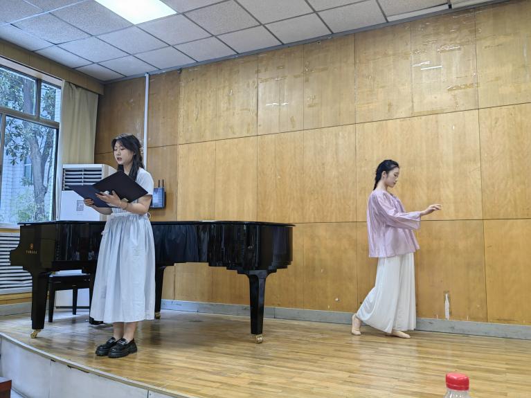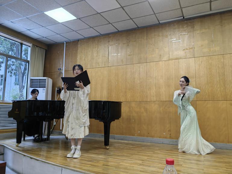 活动现场,同学们将朗诵与舞蹈表演相结合,生动诠释了沈善宝诗词的意境与情感。在《渡黄河》的激昂朗诵中,舞者以刚劲有力的动作展现黄河的壮阔与诗人的豪情;在《踏莎行·题蛱蝶图》的演绎中,轻盈灵动的舞姿则巧妙呼应了诗词中蝶舞花间的唯美画面灵动与诗意画卷的唯美;在《浪淘沙·平湖秋月》悠扬舒缓的朗诵下,舞者舞姿舒展流畅、圆润柔和;伴着《虞美人·送春》略带感伤的吟咏,舞者将春归无觅的惆怅、时光易逝的感怀娓娓道来;《满江红·渡扬子江有感》朗诵雄浑深沉,舞者以稳健厚重、富有张力的步伐与姿态传达深厚的家国情怀。
