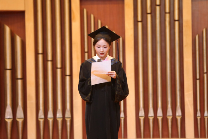 2025届毕业生章艺可代表全体毕业生发言,深情回顾了在舞蹈学院的成长点滴,感恩收获了珍贵的同窗情谊,真挚表达了对学院领导与老师们在关键时刻给予无私关怀与支持的崇高敬意与衷心感谢。她代表全体毕业生承诺,将秉承师训,以奋斗书写青春,以所学服务社会,将个人理想融入国家发展。