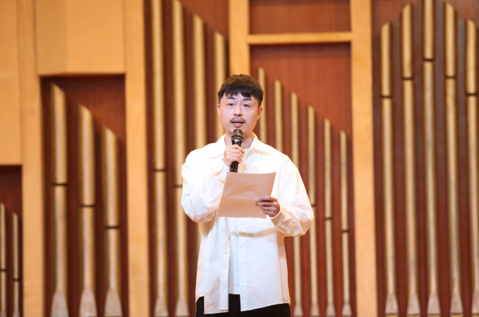 教师代表卜瑞表达了对陪伴学生四年的荣幸与不舍,他回顾了同学们用才华和汗水在排练厅、在舞台谱写的青春华章,寄语广大毕业生带着对艺术的热爱与执着,勇敢征服更广阔的人生舞台,祝福他们“出走半生,归来仍是少年”。