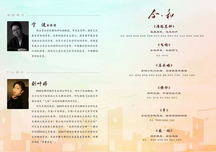 中国古建筑“气韵”舞蹈作品《合·和》,是探究中国古建筑“气韵”出发的编舞实践研究,晚会起名为《合·和》,第一个“合”聚焦于中国古建筑的物质载体,从建筑的结构和形式出发, 找到一种气韵感从而催生出具有合和之美的古建筑舞蹈状态。第二个“和”是找寻人和建筑的一种共同的诉说状态,是在建筑审美到人体转换之后,在“我”认知下的建筑“气韵感”及“生命节奏”的体现。
