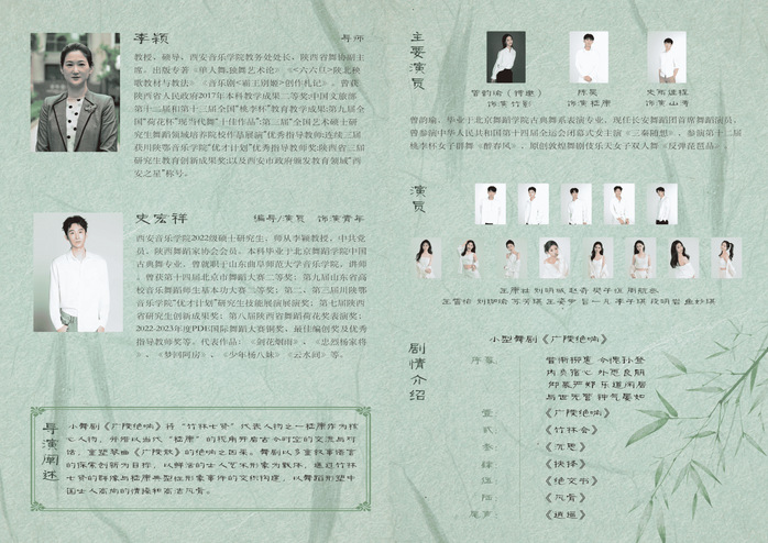 在《唐诗“意境”编舞实践研究》的研究方向下,确定小舞剧名为《亦诗亦舞》,小舞剧分为三个视角切入展开,分别是“亦情”、“亦景”、“亦人”。小舞剧《亦诗亦舞》分别以:《序》、《静夜思》、《侠客行》、《华岳仙掌》、《将进酒》、《风别柳》、《清平调》、《尾声》八个小作品组合形成。试图通过在唐诗意境中找到对位现今社会的精神情感,以践行“坚定文化自信,发展传统文化”的方针,以艺术作品的形式激发当今人民精神家园的回归。