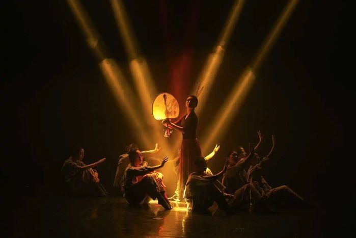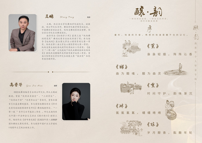 《酿·韵》是基于左权小花戏的舞蹈实践研究。深入研究其动律、体态、步伐、扇花等,进行动律的解构与重构、性格的转化与重塑、形态的传承与创新,并结合古典舞及当代舞语汇来编创,展现手工酿醋中“蒸、酵、熏、淋、陈”几个步骤。承载匠人对工艺的坚守,是一种文化的传承,也是一种精神的寄托,让人在忙碌的生活中,不断回味来自大自然的纯粹与岁月的韵味。