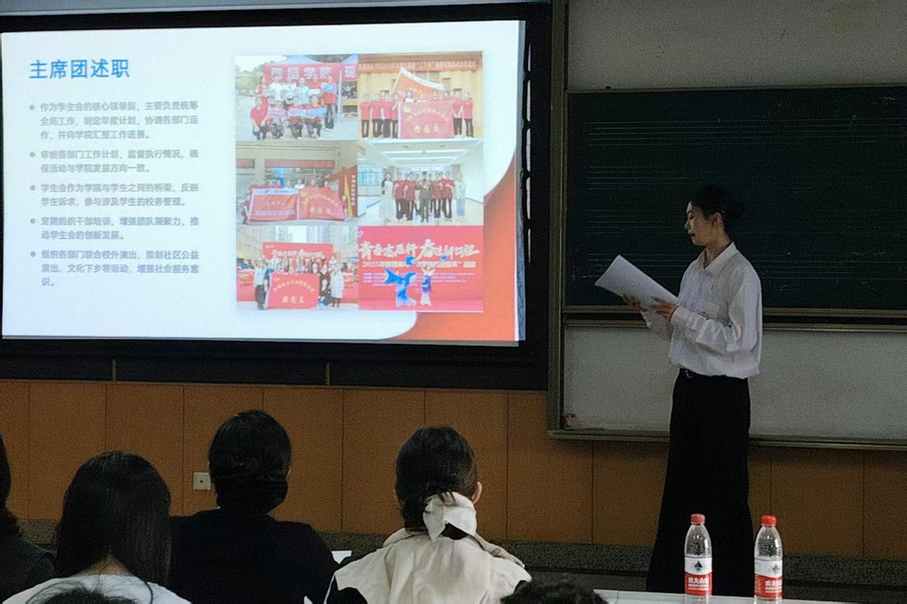 竞聘环节,同学们根据自身兴趣和特长选择心仪的部门进行个人展示。大家围绕自我介绍与个人优势展开:有人分享高中学生工作经历,展现统筹协调能力;有人展示短视频、推文作品,凸显新媒体技能;有人讲述公益服务经历,传递服务热情,充分展现了舞蹈学院学子的担当与活力。现场气氛热烈,展现了舞蹈学院学子积极参与集体事务、勇于展示自我的良好风采。