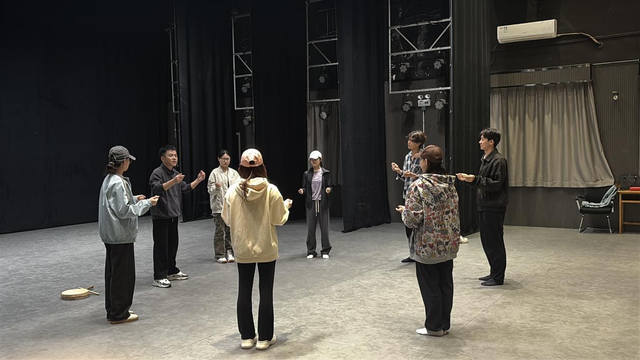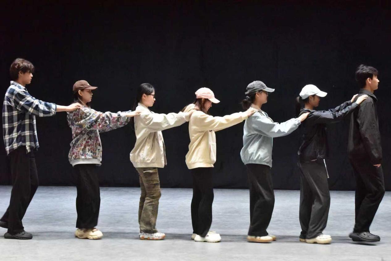 在讲解肢体叙事的方法时,仝教授先是亲身示范根据音乐节奏来做舞蹈动作,让同学们体会什么是用身体讲故事。随后,挑选八到十位同学分为四个板块进行实践训练:一是协调性节奏训练,是小组间破冰放松的环节。其中手和脚的肢体配合就相当于戏剧中的台词加形体动作;二是行进肢体动作接龙,让同学们发散思维、即兴创意。呼吸就是节奏,节奏就是身体作品和对舞台的理解;三是团队数字造型,小组配合用肢体表现具体数字,在空间里建立新的空间;四是无实物鹅绒传递,锻炼大家的表演能力和信念感。通过意识指挥呼吸,呼吸影响想象中的鹅绒,再将这个意图通过身体表现出来。仝教授特别指出,站在舞台上要用心去感受音乐不要着急表演,表演是眼神的交流,要学会用眼神去表达故事。上台要放下评判意识,心无杂念的去创作。